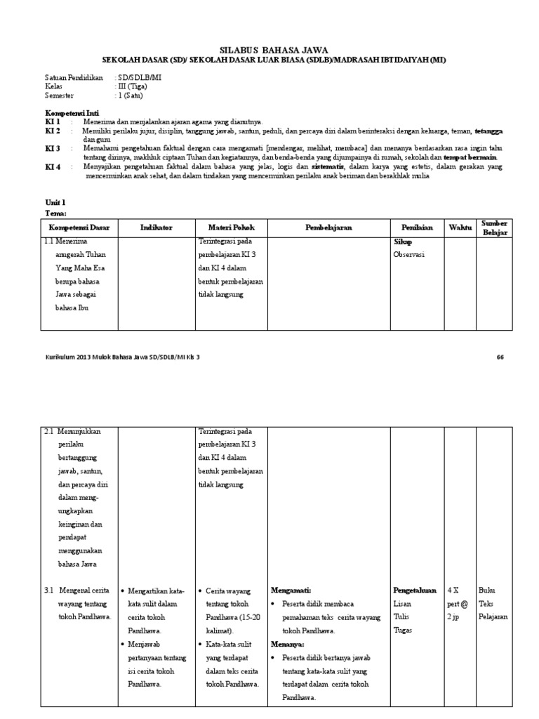 Silabus bahasa jawa kelas 4 sd semester 1 dan 2 kurikulum 2013 mata pelajaran bahasa jawa merupakan muatan lokal provinsi khususnya di provinsi jawa tengah. Silabus bahasa jawa kelas 4 sd semester 1 dan 2 kurikulum 2013, mata pelajaran bahasa jawa merupakan muatan lokal provinsi, khususnya di provinsi jawa tengah. Sd negeri sukorukun kelas : Untuk lembaga pendidikan di bawah naungan kementerian agama, kanwil. Memiliki perilaku jujur, disiplin, tanggung jawab, santun, peduli, dan percaya diri dalam berinteraksi dengan keluarga, teman, tetangga dan guru.